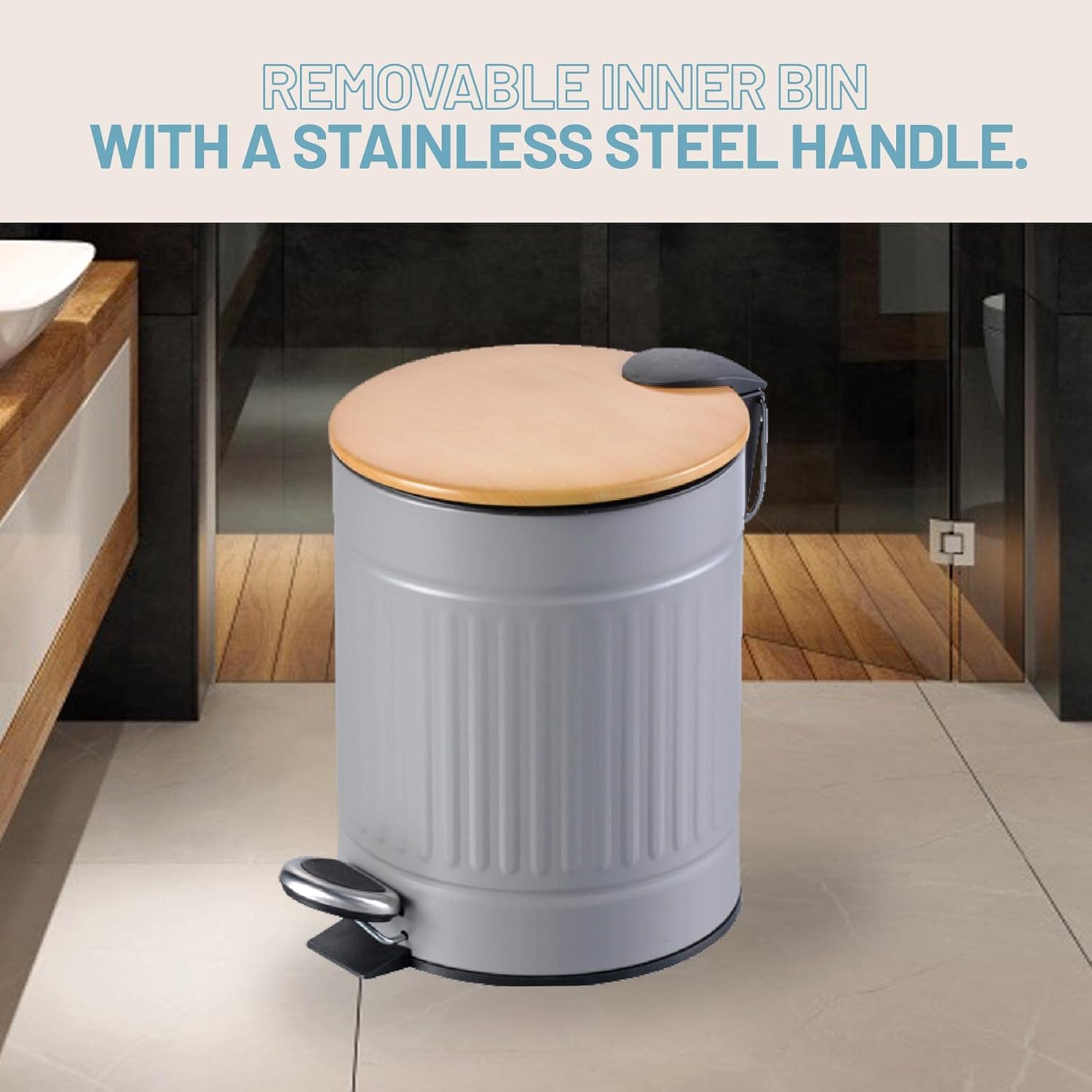 Textured Gray Stainless Steel Trash Can with Wooden Lid and Soft Closure (5 Liters / 1.3 Gallons)